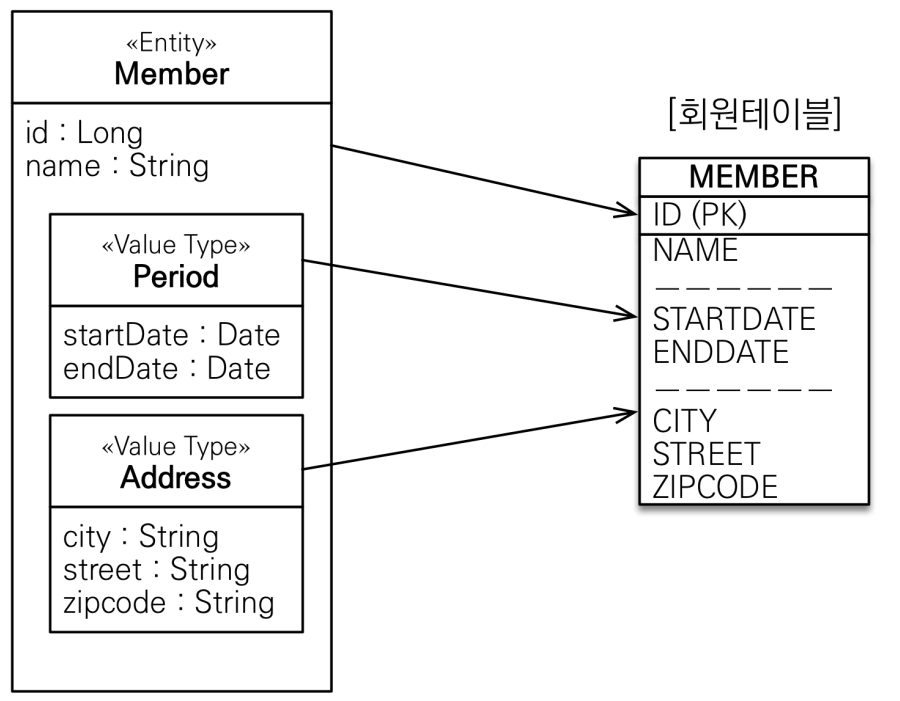 - 임베디드 타입을 사용하기 전과 후의 매핑하는 테이블에는 차이가 없다.