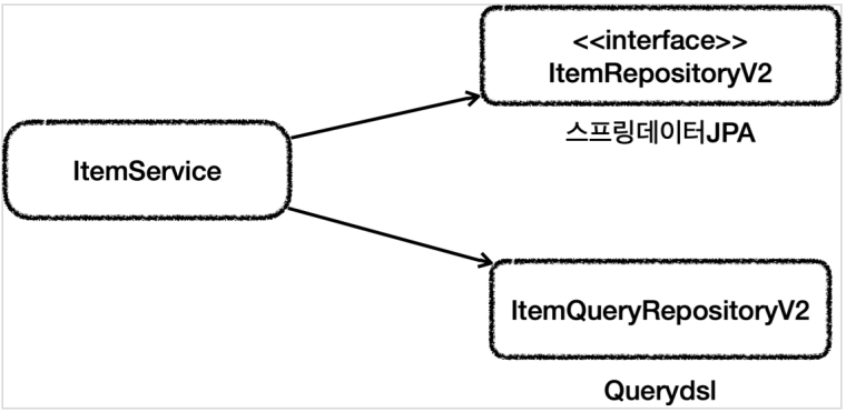 ItemServiceV2 는 스프링 데이터 JPA를 제공하는 ItemRepositoryV2 도 참조하고, Querydsl과 관련된 ItemQueryRepositoryV2 도 직접 참조한다. 덕분에 ItemRepositoryV2 를 통해서 스프링 데이터 JPA 기능을 적절히 활용할 수 있고, ItemQueryRepositoryV2 를 통해서 복잡한 쿼리를 Querydsl로 해결할 수 있었다.