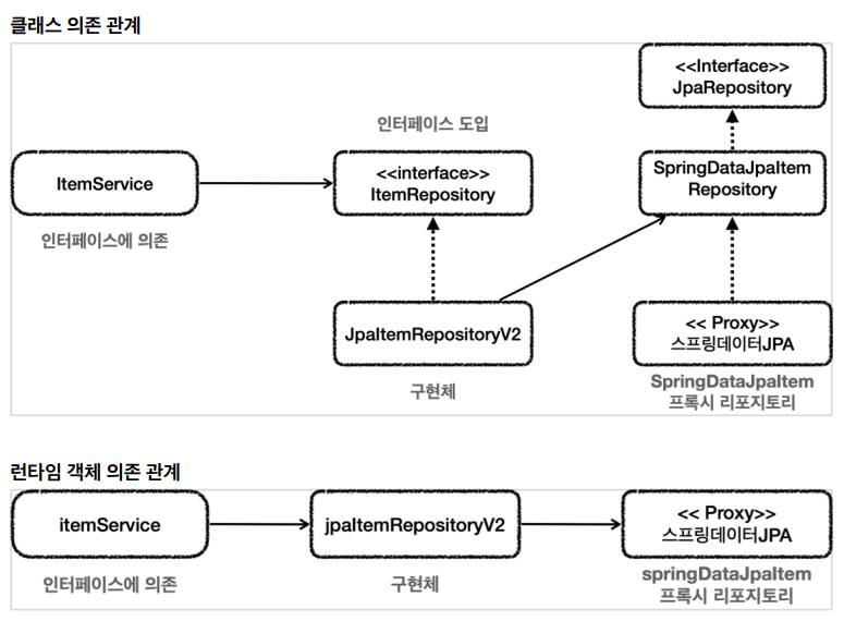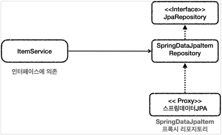 ItemService가 ItemRepository에 의존하고 그러한 코드를 수정하지 않고 스프링 데이터 JPA를 사용하기 위해 JpaRepository가 아닌 ItemRepository를 상속받는 중간 Repository를 하나 두어 만들었었다.
