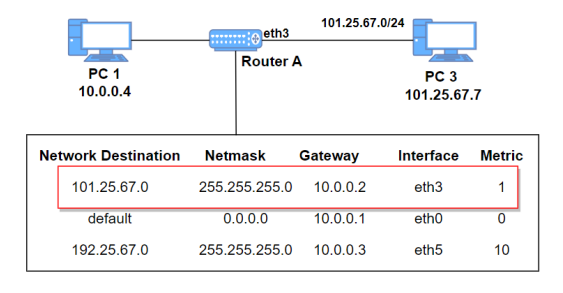 PC1(10.0.0.4)이 101.25.67.0 네트워크에 있는 PC3(101.25.67.7)에 패킷을 보내려고 한다고 가정한다. 이 때 Router A를 거쳐 전달되게 된다.