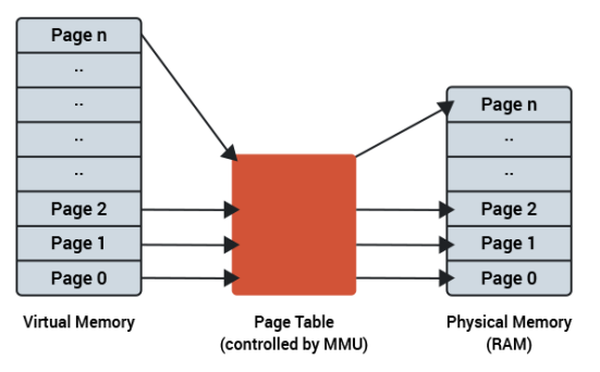 가상주소가 MMU와 페이지테이블에 의해 실제 주소(실제 메모리 자원)로 변환된다.