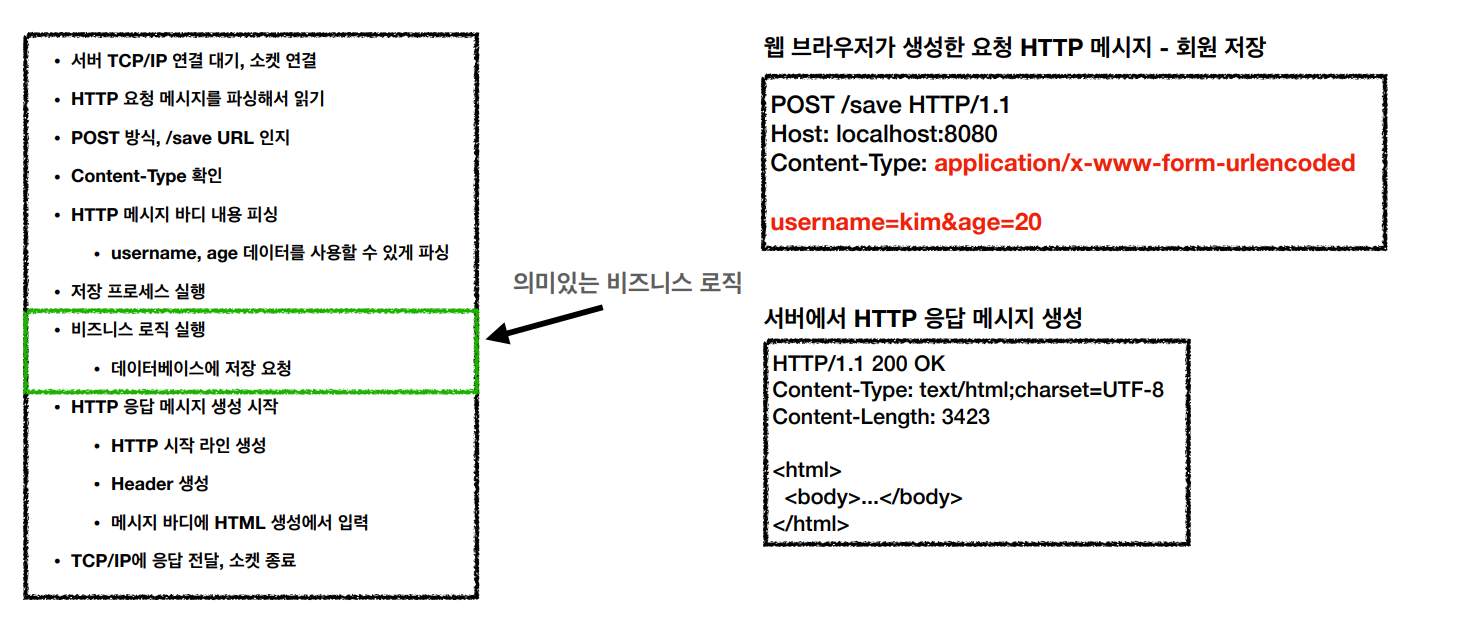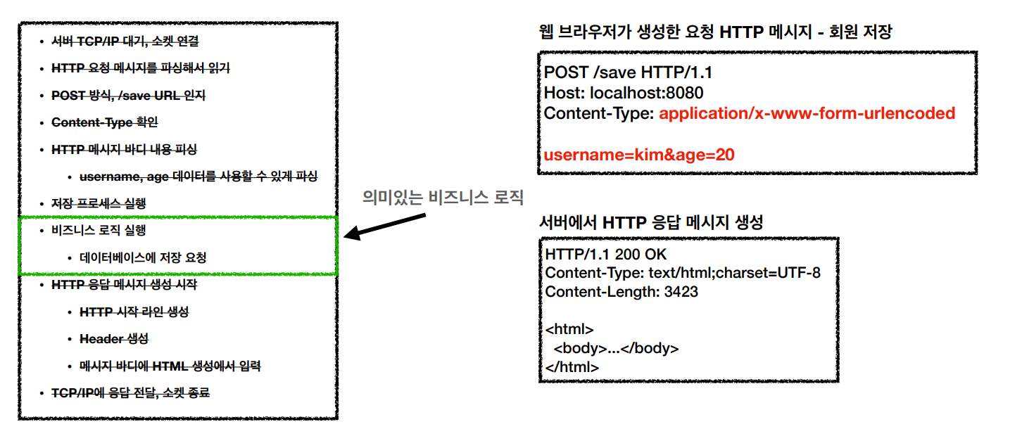 여기서 그때마다의 비즈니스 로직은 일부분이고 HTTP 메시지를 파싱하고 분석하는 그런 나머지 부분은 어떤 비즈니스 로직을 개발하든 공통적으로 처리해야되는 동작이다.