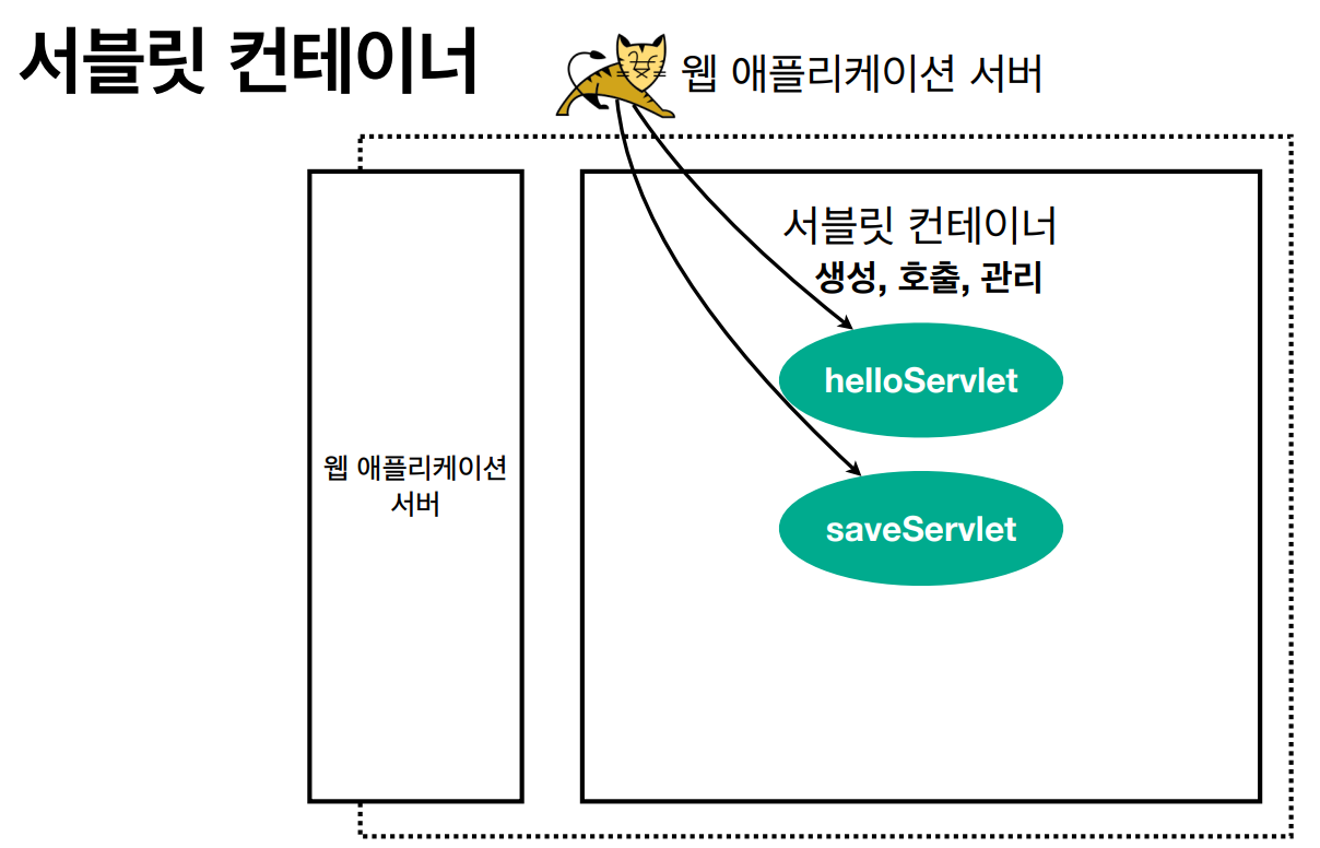 - 서블릿 컨테이너는 서블릿 객체를 생성, 초기화, 호출, 종료하는 생명주기 관리