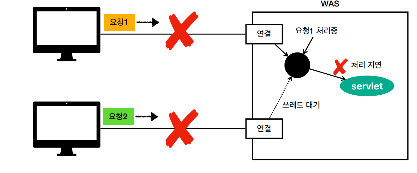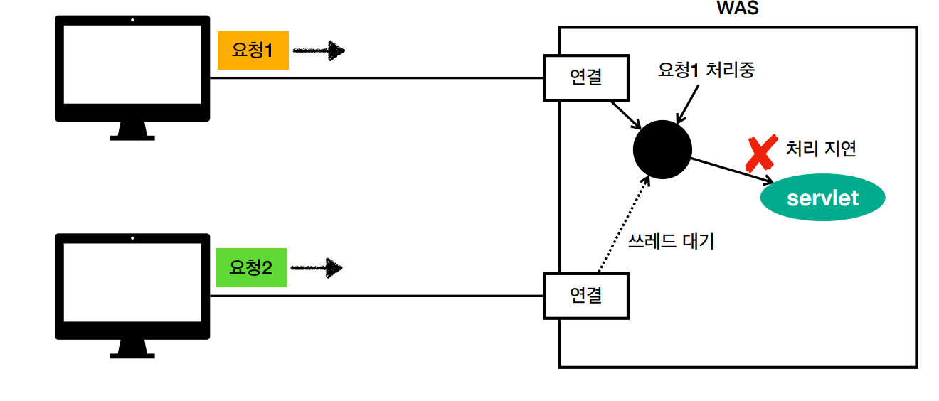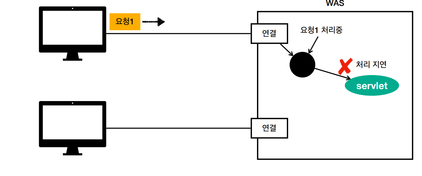 요청1에서 쓰레드를 사용하는데 처리에 지연이 발생했다. 이 때 요청2가 들어온다면 쓰레드를 사용하지 못한다. 이러면 둘 다 지연이 발생하고 오류가 발생할 수 있다.