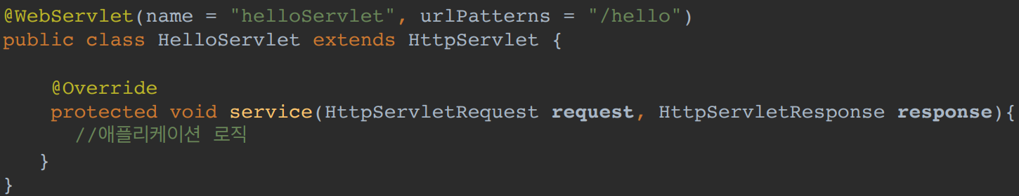 - urlPatterns(/hello)의 URL이 호출되면 서블릿 코드가 실행.