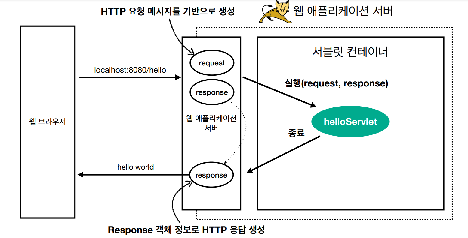 - WAS는 Request, Response 객체를 새로 만들어 서블릿 객체 호출