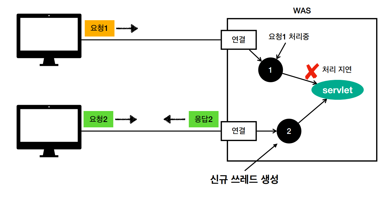 요청1의 처리가 지연이 되어도 요청2의 쓰레드가 따로 생성되었기 때문에 그 쓰레드는 정상적으로 서블릿 객체를 호출하고 처리할 수 있다.