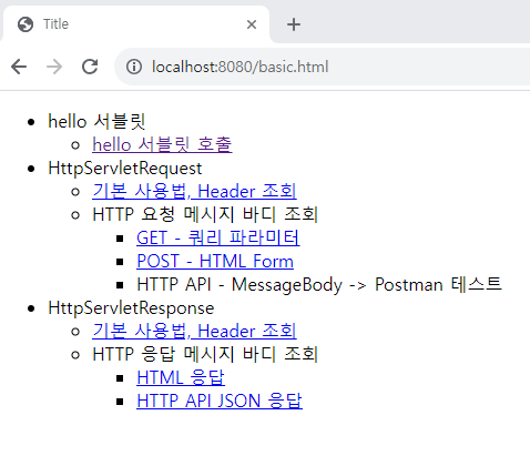 작성해 둔 basic.html은 이러한 구성이다. 예를 들어 hello 서블릿 호출은 href=”/hello?username=servlet” 으로 되어있어 위에서 작성한 request로 쿼리를 받고 response를 이용해 출력하는 부분을 쉽게 확인할 수 있다.