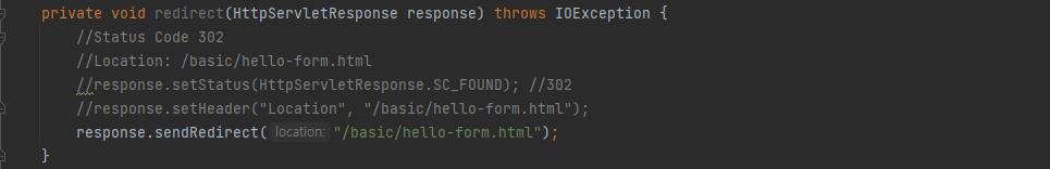 주석처럼 status 코드를 따로 setStatus 해주지 않아도 sendRedirect()를 이용하면 302로 설정된다.