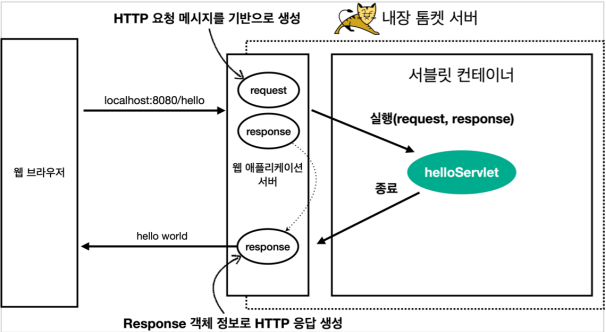 서블릿은 톰캣 같은 웹 애플리케이션 서버를 직접 설치하고 그 위에 서블릿 코드를 클래스 파일로 빌드해서 올린 후 톰캣 서버를 실행하면 된다. 이러한 과정은 번거롭기 때문에 스프링부트를 사용해 톰캣 서버를 설치없이 편리하게 서블릿 코드를 실행한다.