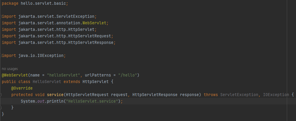 위와 같이 @ServletComponetScan을 추가해주고 아래의 HelloServlet을 작성 후localhost:8080/hello 로 들어가면 service 함수가 실행된다.