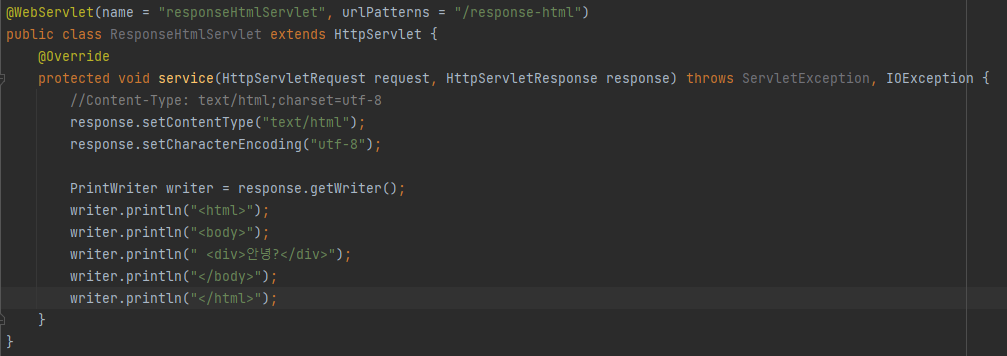 writer로 직접 쓴 html을 보내게 된다. 브라우저에서 보면 안녕? 만 뜨게 된다.