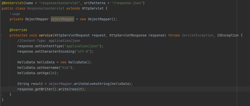 위에서 사용했던 HelloData 객체를 이용해 JSON 형태의 메시지를 응답할 수 있다. objectMapper는 객체를 JSON 문자로 변경하기 위한 것이다.