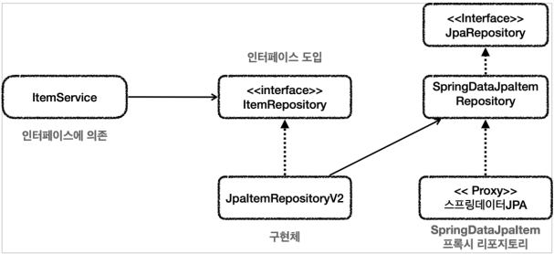 - ItemService는 ItemRepository에 의존하기 때문에 ItemService에서는 JpaRepository를 인터페이스 상속받는 SpringDataJpaItemRepository를 직접 사용할 수 없다.