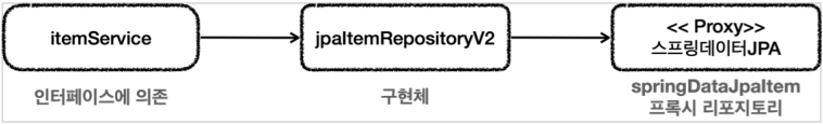 - JpaItemRepositoryV2는 ItemRepository를 구현한다. 그리고 JpaItemRepositoryV2가 SpringDataJpaItemRepository를 사용한다.