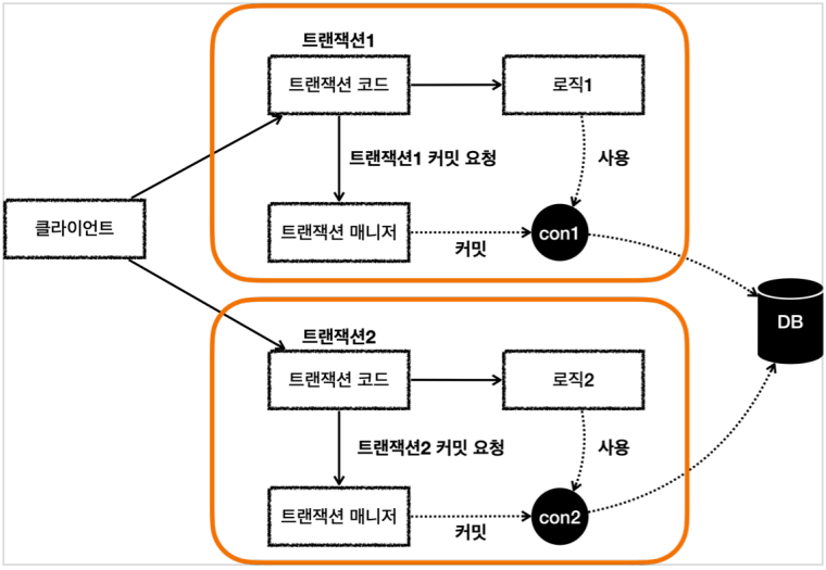 - 각각 별도의 DB 커넥션을 따로 사용하게 되는 것이다.
