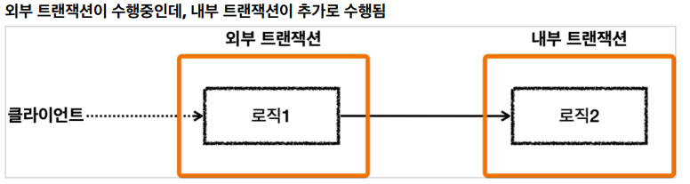 - 내부 트랜잭션: 외부 트랜잭션이 수행되고 있는 도중 호출되는 트랜잭션.