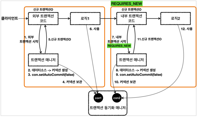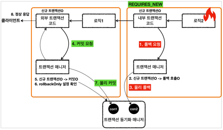 - 트랜잭션 매니저는 REQUIRES_NEW 옵션을 확인하고 기존 트랜잭션에 참여하는 대신 새로운 트랜잭션을 시작한다.