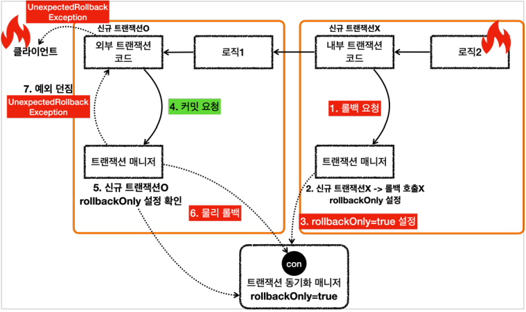 - 로직이 끝나고 트랜잭션 매니저를 통해 내부 트랜잭션을 롤백한다.