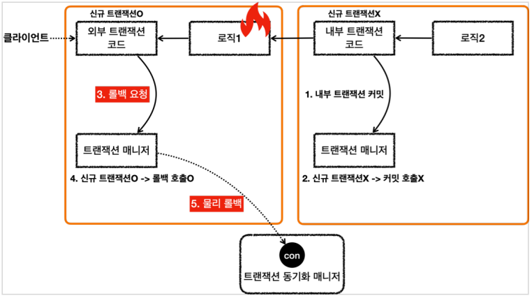 - 하나의 논리 트랜잭션이라도 롤백되면 물리 트랜잭션은 롤백된다.