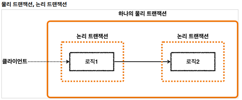 - 물리 트랜잭션: 실제 데이터베이스에 적용되는 트랜잭션을 뜻한다. 실제 커넥션을 통해 트랜잭션을 시작하고, 실제 커넥션을 통해 커밋/롤백한다.