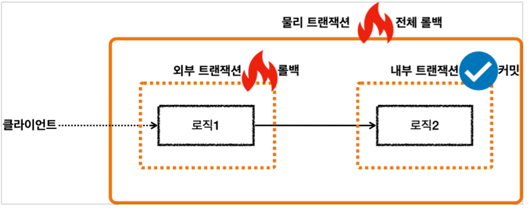 - 이 경우 내부 트랜잭션이 롤백되면서 로직2가 롤백되어도 로직 1에서 저장한 데이터에는 영향을 주지 않는다.