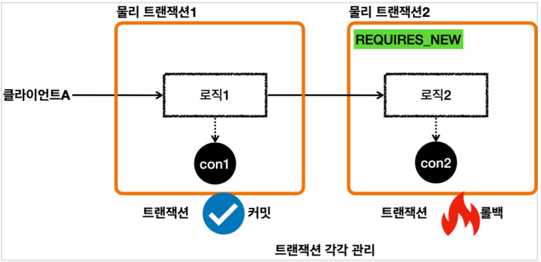 - 위와 같이 물리 트랜잭션을 분리하려면 내부 트랜잭션을 시작할 때, REQUIRES_NEW 옵션을 사용하면 된다.
