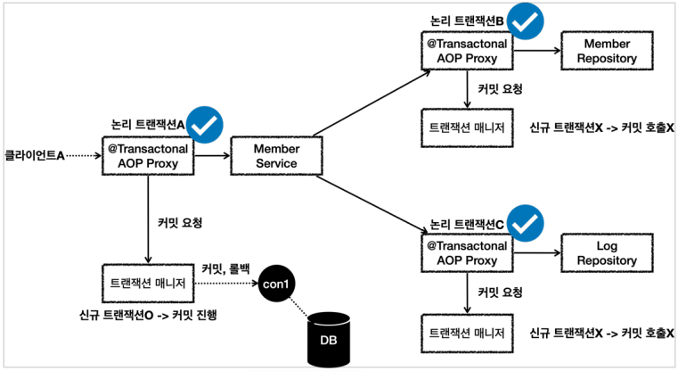 - 외부에 있는 신규 트랜잭션만 실제 물리 트랜잭션을 시작하고 커밋한다.