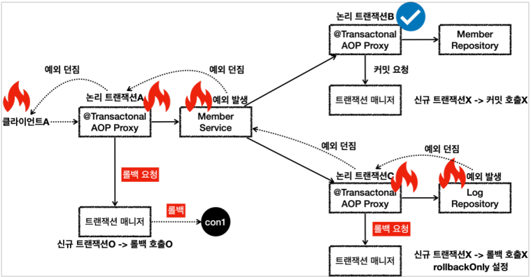 트랜잭션 AOP가 정상 커밋을 요청해도, 이미 로그 리포지토리에서의 트랜잭션 AOP가 rollbackOnly 마킹을 해놓았기 때문에 롤백된다.