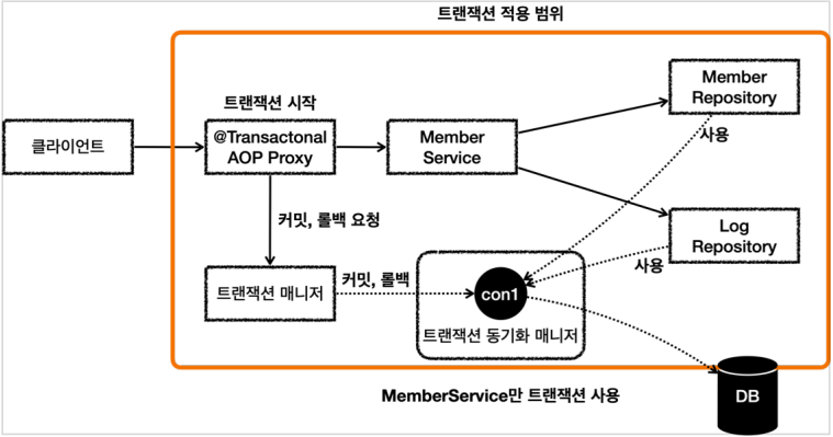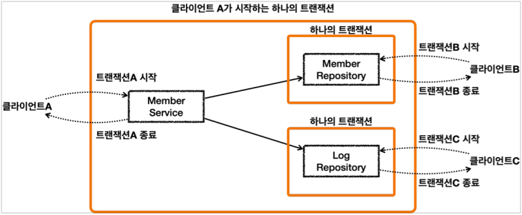 - 클라이언트 B는 MemberRepository만 사용하고 해당 리포지토리에서만 트랜잭션을 사용하고 싶어 한다.