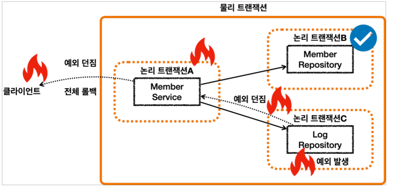 - 트랜잭션 AOP는 런타임 예외이므로 트랜잭션 매니저에 롤백을 요청한다. 이 때 물리 트랜잭션이 아니므로 실제 롤백을 하진 않고, rollbackOnly를 설정한다.