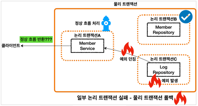 로그에서 예외 상황이 발생하면 memberRepository의 트랜잭션은 정상적으로 커밋하고, logRepository의 트랜잭션은 롤백하게 된다.