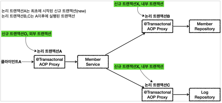 이렇게 하고 MemberService에서 각 Repository를 호출하면 각 리포지토리의 트랜잭션은 서비스의 물리 트랜잭션에 참가하게 된다.