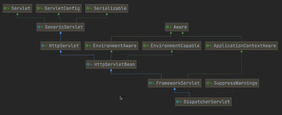 - DispatcherServlet -> FrameworkServlet -> HttpServletBean -> HttpServlet