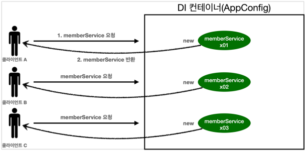 스프링 컨테이너 덕분에 고객의 요청이 올 때 마다 객체를 생성하는 것이 아니라, 이미 만들어진 객체를 공유해서 효율적으로 재사용할 수 있다.