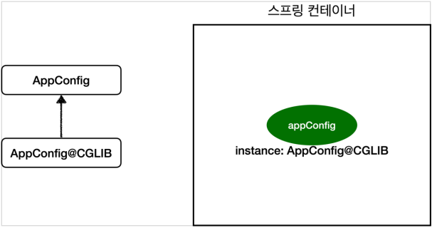 스프링이 CGLIB라는 바이트코드 조작 라이브러리를 사용하여 AppConfig 클래스를 상속받은 임의의 다른 클래스를 만들고, 그 다른 클래스를 스프링 빈으로 등록한 것.