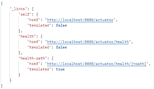 애플리케이션을 실행 후 http://localhost:8080/actuator 요청을 하게 되면 아래와 같이 응답이 나타난다.