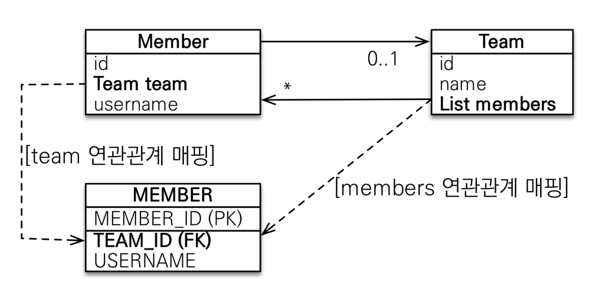 테이블의 입장에서는 원래 외래 키 하나로 양방향 매핑이 되는 것이다. 하지만 객체 입장에서는 members라는 List를 세팅해주지 않으면 불가능하다.