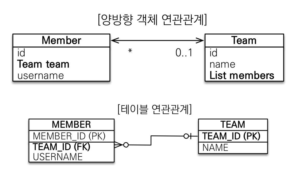객체의 양방향 관계는 사실상 양방향 관계가 아닌 서로 다른 단방향 관계 2개인 것이고, 테이블은 외래 키 하나로 두 테이블의 연관관계를 관리하며 양방향 연관관계를 가지는 차이가 있다.