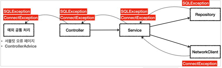 컨트롤러나 서비스 입장에서 본인이 처리할 수 없음에도 어쩔수 없이 throws를 통해 던지는 예외를 선언해야 한다.