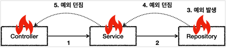 컨트롤러에서 서비스를 호출하고 그 서비스에서 리포지토리를 활용해야하는데, 리포지토리에서 Exception이 발생했다고 가정하자.