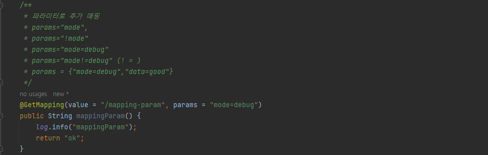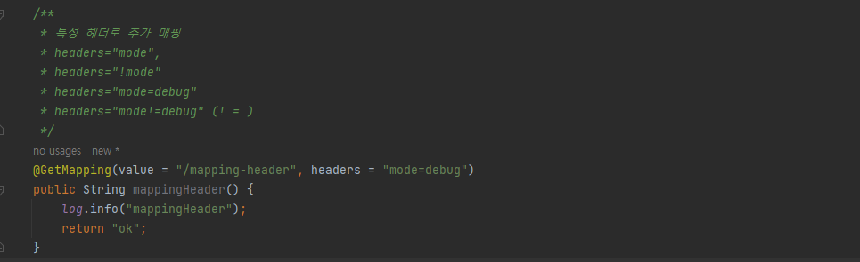 URL에서 파라미터를 가져오는 것이 아닌 헤더에 mode : debug 가 있으면 매핑이 된다.