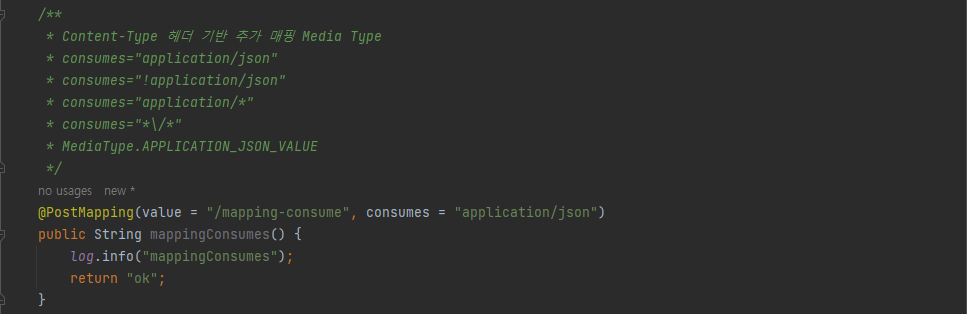 consume은 컨트롤러 입장에서 보면 content-type을 소비한다고 볼 수 있기 때문에 이렇게 표현한다고 보아도 된다.