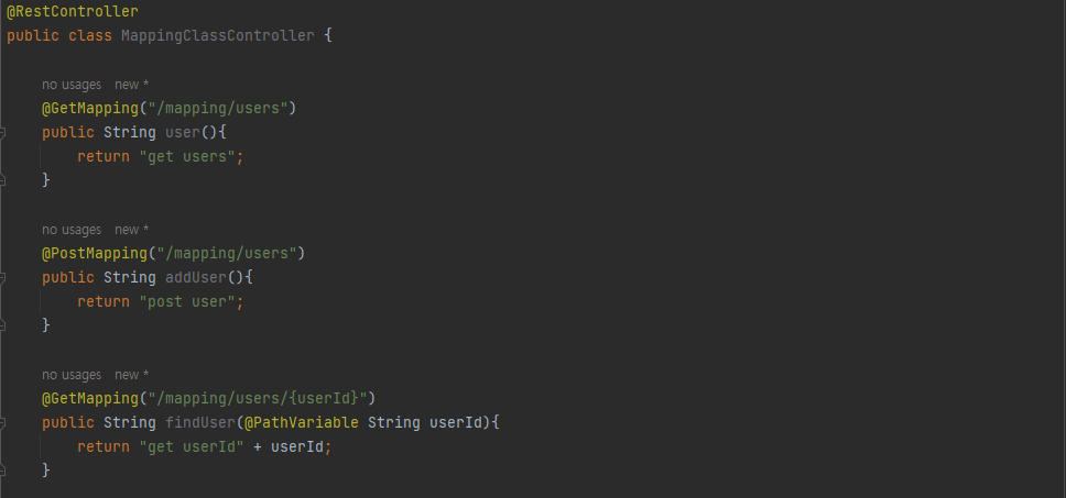 컨트롤러를 리팩터링하려면 위에 클래스 단위로 @RequestMapping(“/mapping/users”)를 해주어 중복되는 부분을 제거하는 방법이 있다.