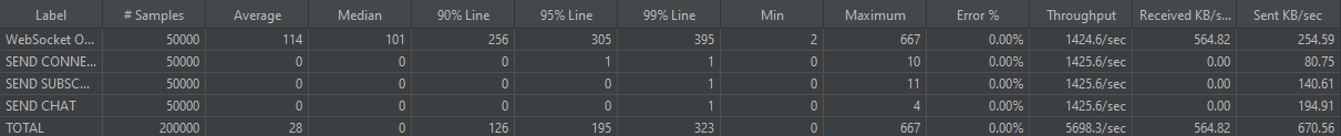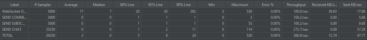 - loop: 1 (이제 whileController로 메시지 전송을 처리하기 때문에 3000users에서 연결을 1번 하는 것으로 수정)