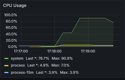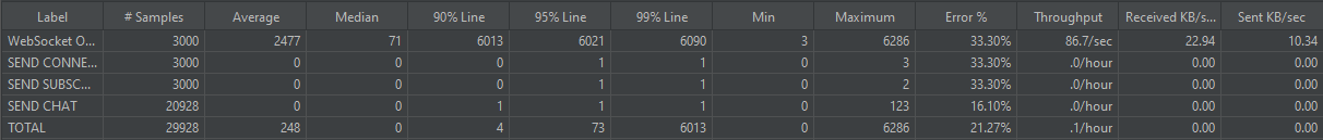 그런데 현재 메시지 처리량을 높이면서 테스트를 하고 있는 것은 맞지만, 메시지 처리량의 수보다 연결 부분에서 이미 에러가 나고, 처리가 제대로 안되고 있기 때문에 성능을 확인할 수 있는 메시지의 양만큼 테스트가 제대로 되고 있지 않다.