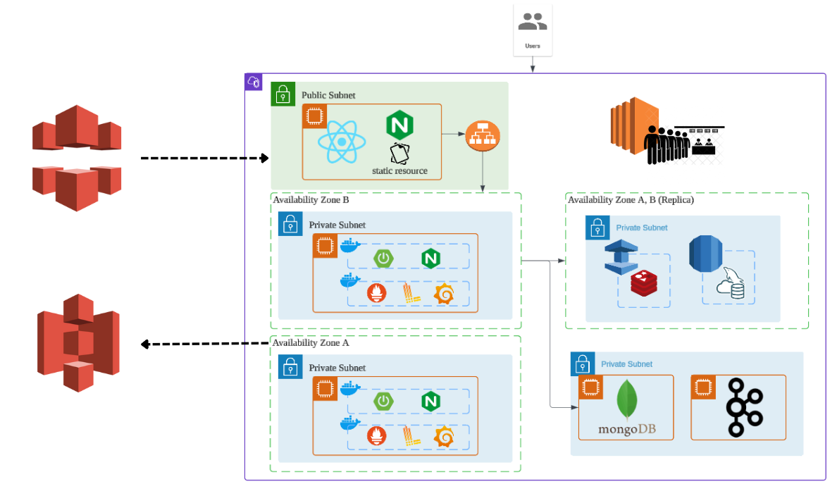- 백엔드 메인 서버는 각 AZ에 배치되어 로드밸런서가 트래픽을 분산처리하도록 구성했다.