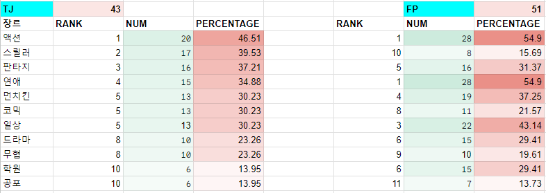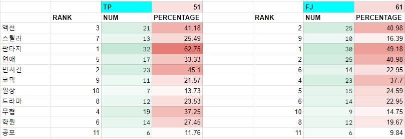 일례로 일상 장르의 경우 T와 P에서 각각 9위, 3위를 차지하고 있는데, TP를 조합했을 때 일상 장르는 선호장르 10위인 최하위권을 차지하고 있다.