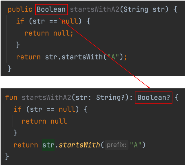 fun startsWithA(str: String?): Boolean {