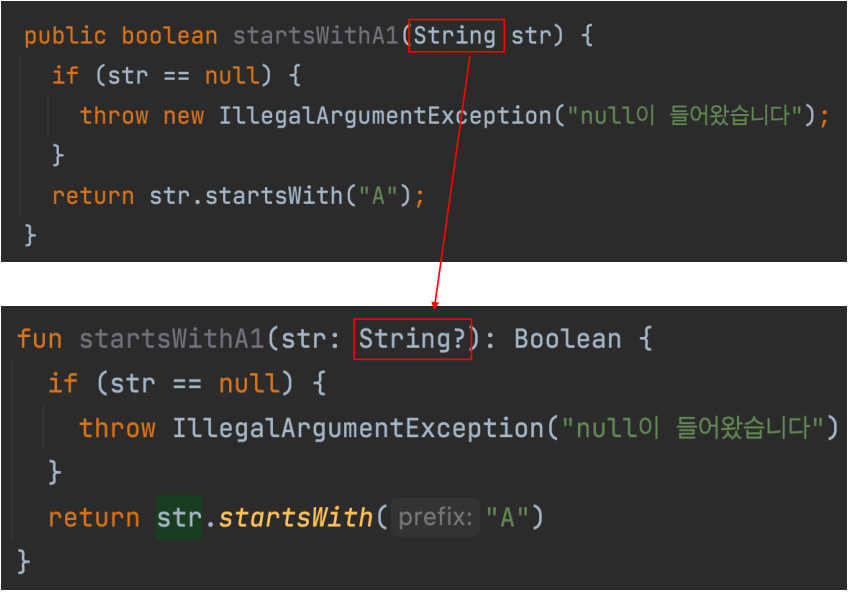- null 값이 들어갈 수 없는 타입이므로 바로 startsWith 메서드를 반환해도 에러가 발생하지 않는다.